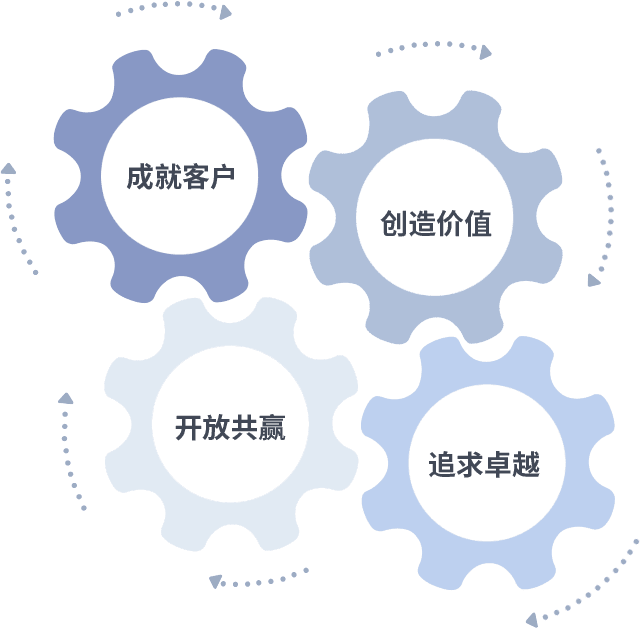 成就客户是一切决策的出发点,,创造价值是衡量所有工作的标准,,,,追求卓越是我们做事做人的态度,,,开放共赢是我们的格局也是最终的结果。。价值观的齿轮环环相扣,,推动着组织里的每个人不断向前。。