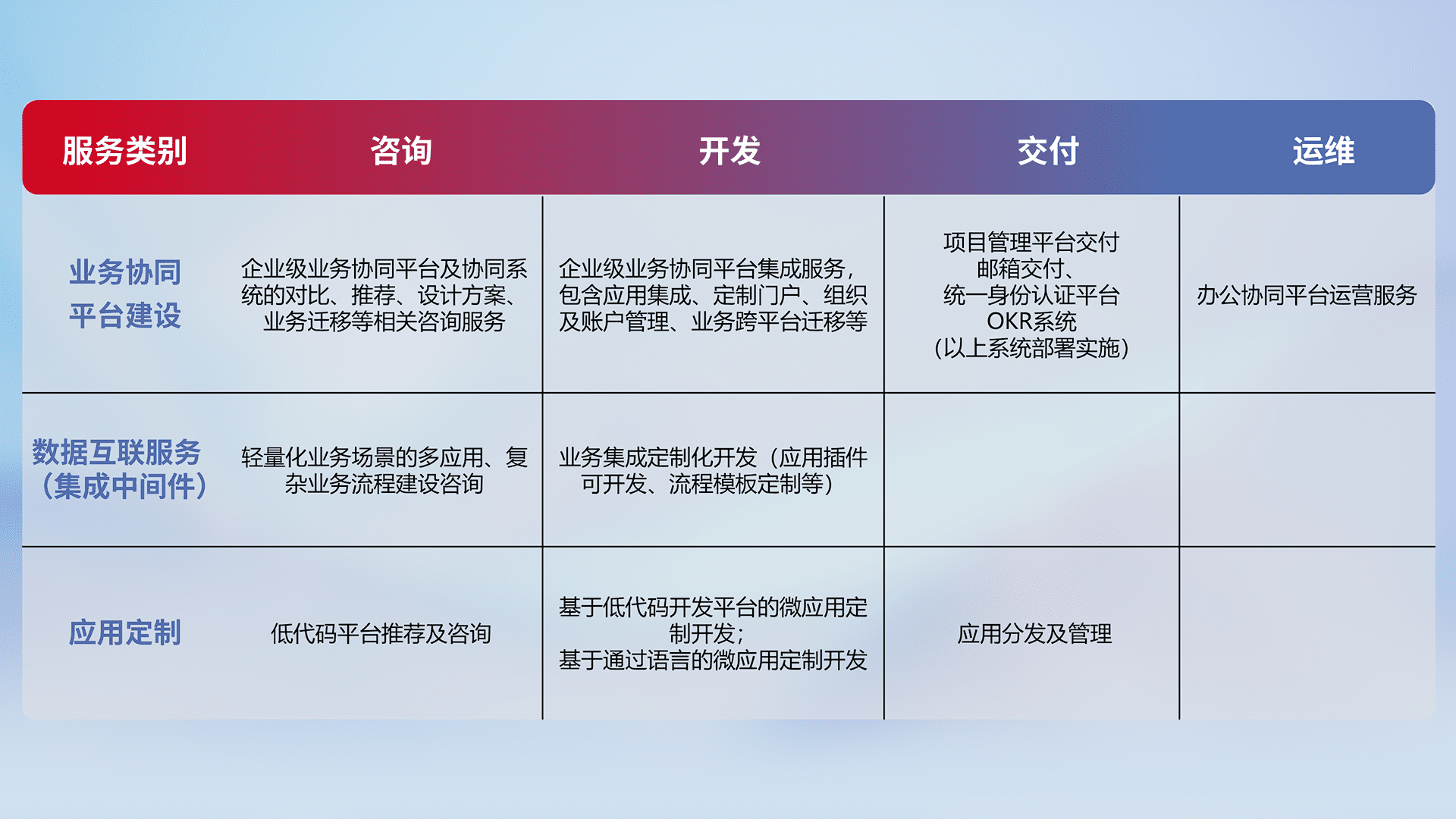 针对钉钉、、企微、、IDaas等平台级产品提供产品的规划、、方案、、、交付、、、、定制化开发等服务,,实现如统一协同办公、、、、智能客户服务、、、混合会议管理、、、、智能数据查询、、、、等业务场景,,实现数字化转型。。。